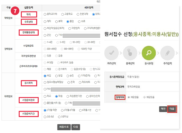 학력 , 수료상태 , 경제활동상태, 응시목적,